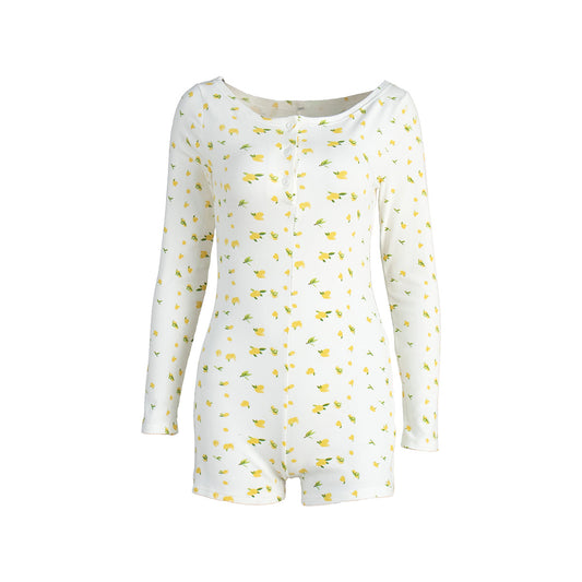 Printed Long-sleeve Jumpsuit Pajamas With Printed Shorts