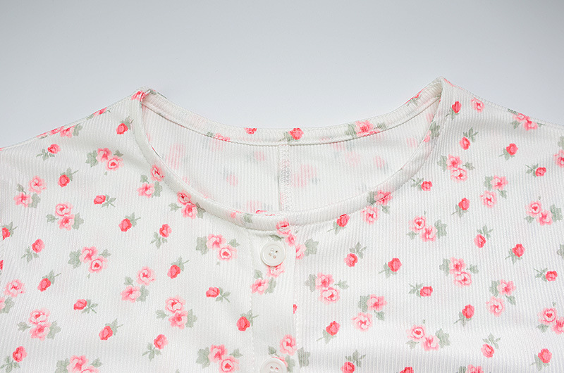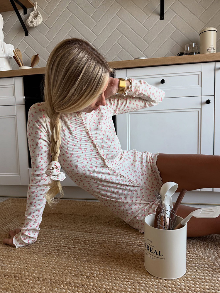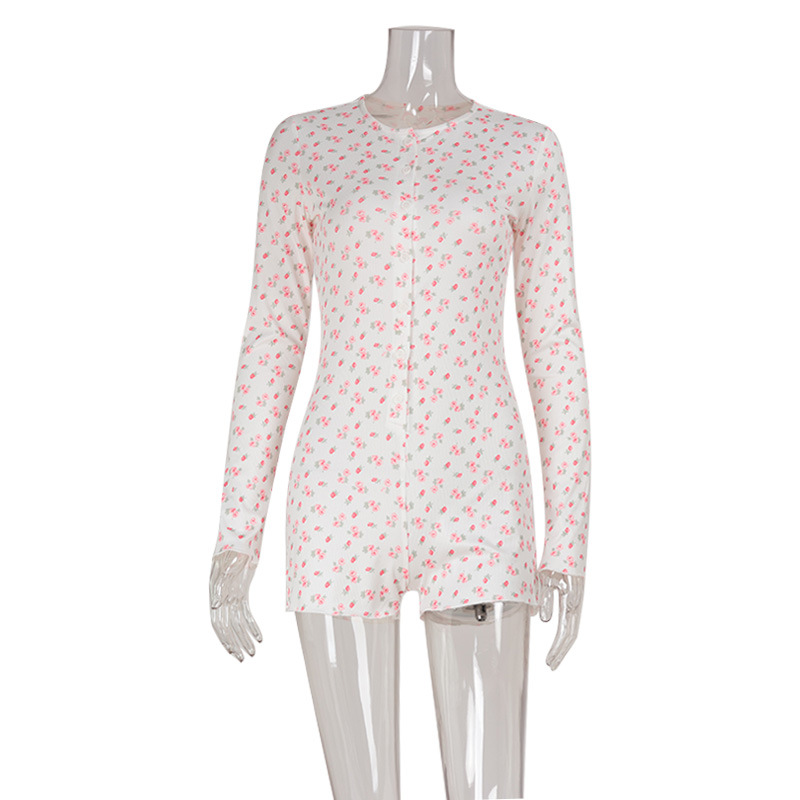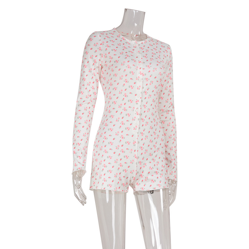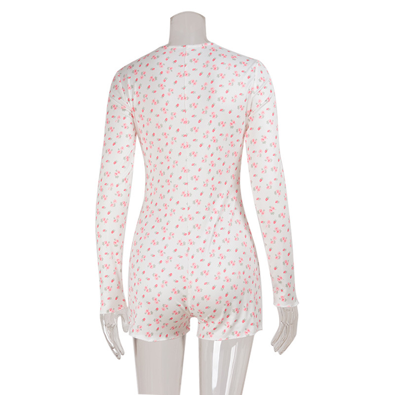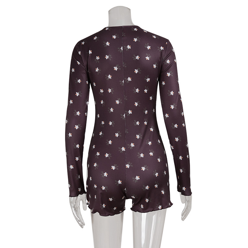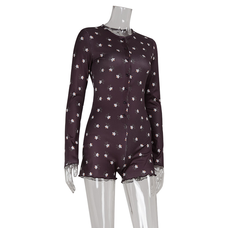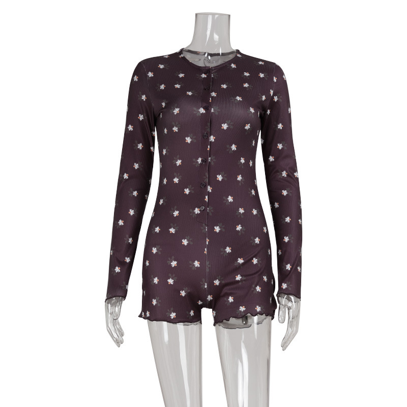 Casual Home Wear Printed Long-sleeve Waist-cinching Jumpsuit